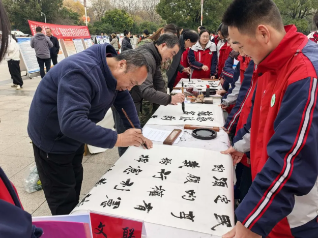 活动现场,书法家们铺展宣纸、挥毫泼墨,将“弘扬宪法精神,建设法治中国”“维护宪法权威,保障人民权益”等宪法宣传标语转化为一幅幅苍劲有力的书法作品,让严肃的法治理念在笔墨间变得生动可感。同时,书法家们还为在场学生书写“精忠报国”“志存高远 脚踏实地”等励志名言名句,用饱含美好祝福的书法作品鼓励他们努力学习、实现梦想。