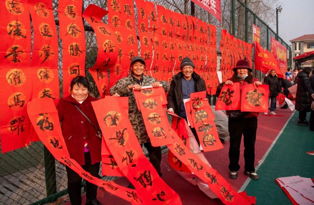现场前来观赏、领取春联与画作的村民络绎不绝。拿到春联和马画的村民们脸上都洋溢着幸福的笑容,有的小心翼翼地捧着晾晒春联、抚平画纸,有的当场拍照分享到社交平台,热闹氛围感染了整个集市。“手写的春联、手绘的马画才有年味儿,看着这红彤彤的对联和精气神儿十足的马,心里暖和得很,也特意来赶这个热闹,顺便买点山里的好东西。”一位刚领到春联与画作的村民笑着说道。艺术家沉浸式创作,志愿者们则主动帮忙铺纸、晾字、装袋,现场笑语盈盈、暖意融融,勾勒出一幅温馨的乡村图景。